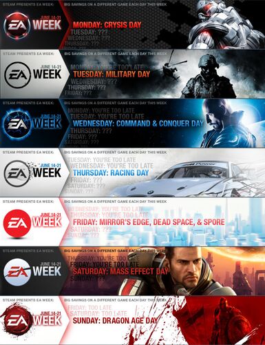 Crysis Maximum Edition $29.98(50%OFF) 日替わりでEA製のゲームがセール対象になる。 ただほとんどのゲームは日本から買えないんだよな・・・。 今後の実施予定は以下のようになっている模様。 月曜:クライシスシリーズ 火曜:ミリタリー(バトルフィールド…
