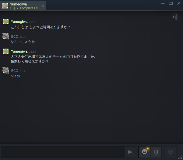昨日から「チームに投票をお願いします」とか「Steamウォレット送るよ」とかいうチャットがSteam経由で送られてきているのだが、これらは全部アカウントハイジャック(ID・パスワードを偽Steamサイトで入力させてSteamアカウントを奪い取る)の手口なので絶対に反応してはダメだ。