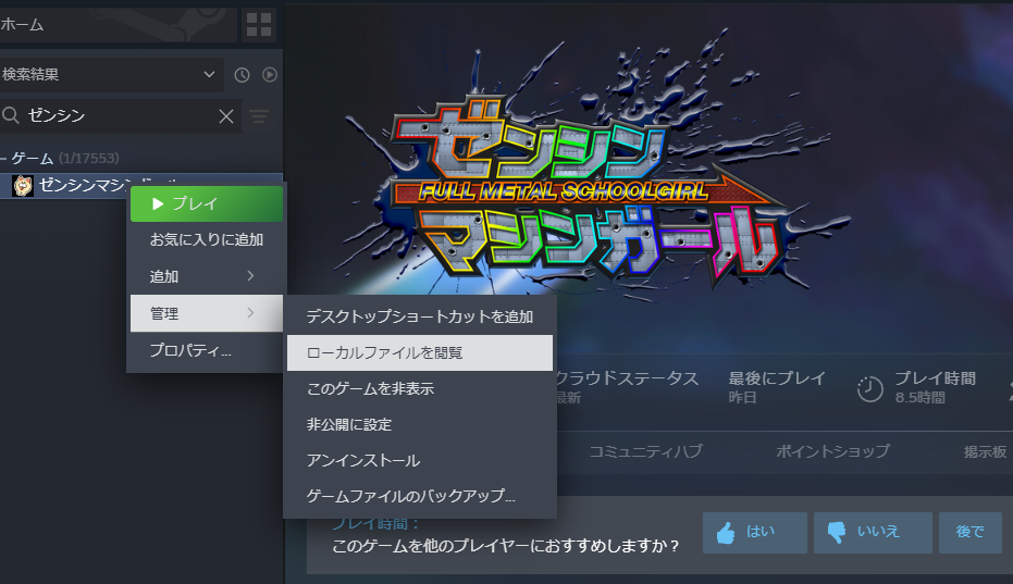 Steamクライアントのゲームライブラリから「ゼンシンマシンガール」を右クリックし、「管理」→「ローカルファイルを閲覧」を選択。